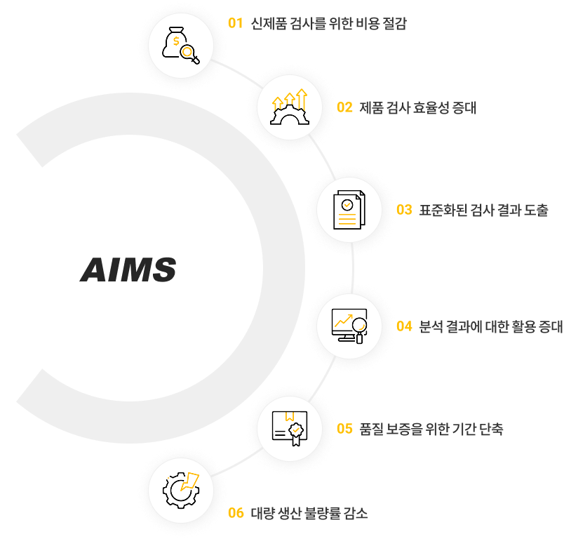 Why AIMS? 다수의 자동화 측정 작업을 위한 가상 측정 작업장 생성 자동화 측정 시스템의 하드웨어 통합 제어 및 운영 가상 측정 시뮬레이션을 통한 최적의 로봇 측정 및 스캐닝 경로 생성 측정 데이터 수집 및 실시간 측정 결과 모니터링 로봇 캘리브레이션 기술을 통한 정밀한 로봇 오프라인 프로그래밍 제공 다양한 케이스에 대한 오류 복구 시나리오 탑재