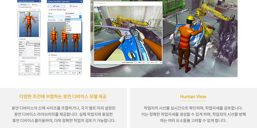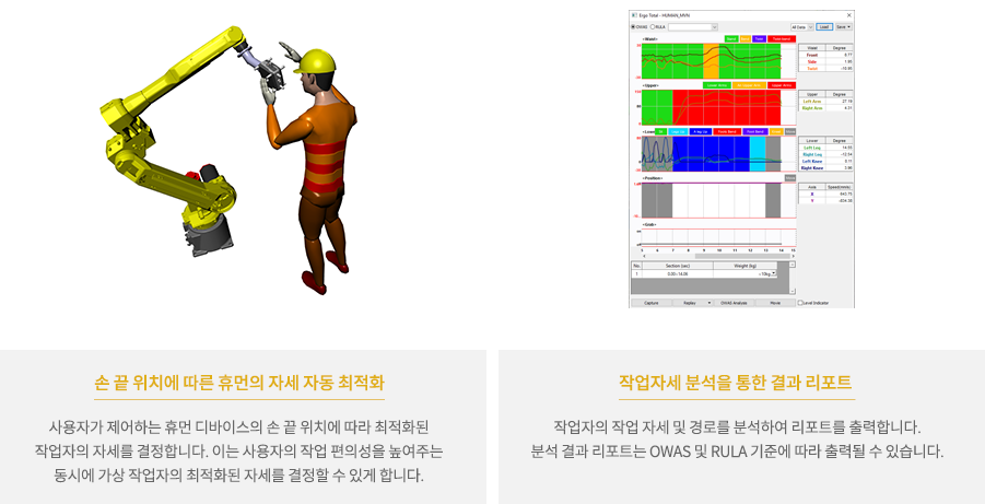 작업자 시뮬레이션 및 자세 분석 DMWorks 3.0 휴먼 시뮬레이션은 가상 작업장에서의 가상 작업자를 통해, 실제 작업장에서 발생할 수 있는 여러 문제들을 사전에 검토하는 다양한 기능을 제공합니다. 작업자의 작업 위험성, 편의성, 피로도 등 여러 요인에 대한 분석을 하여, 현장에서 발생할 수 있는 위험을 제거하고, 효율성을 증가하여 최적화된 작업 환경을 구성할 수 있습니다.