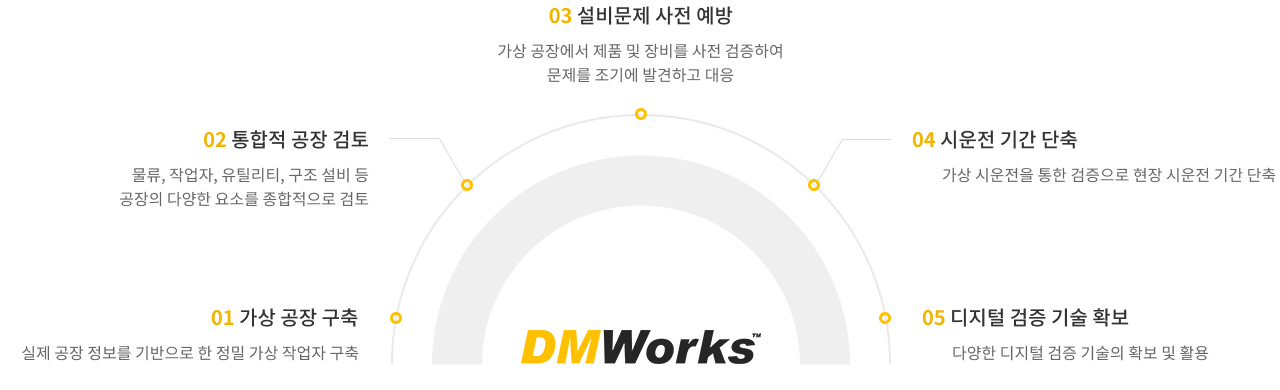 What Can You Do With DMWorks? 제품 개발과정에서의 DMWorks 역할 STEP 01 선행검토 단계 생산정보(설비, 제품, 공법)분석 제품 조립성 검토 STEP 02 공법계획 단계 제품, 설비 배치 및 작업 할당 3D 가상 공장 구축 물류 시뮬레이션 STEP 03 공법검토 단계 제품 생산 가능성 검토 설비 사양 검토 로봇 사양 및 작업성 검토 작업자 작업성 검토 STEP 04 시운전 단계 로봇 작업 프로그램 생성 로봇 및 작업장 캘리브레이션 PLC 시뮬레이션 STEP 05 양산 단계 설비 변경 검토 생산시나리오 변경 신제품 조기 검토 및 모니터링 3D 스캔 레이아웃 구축